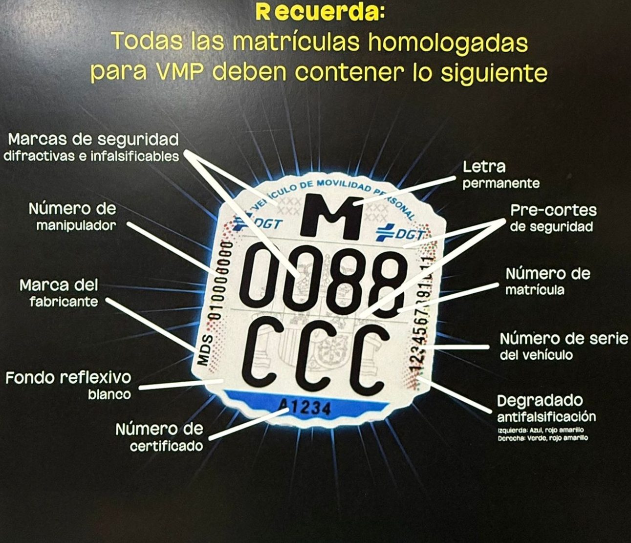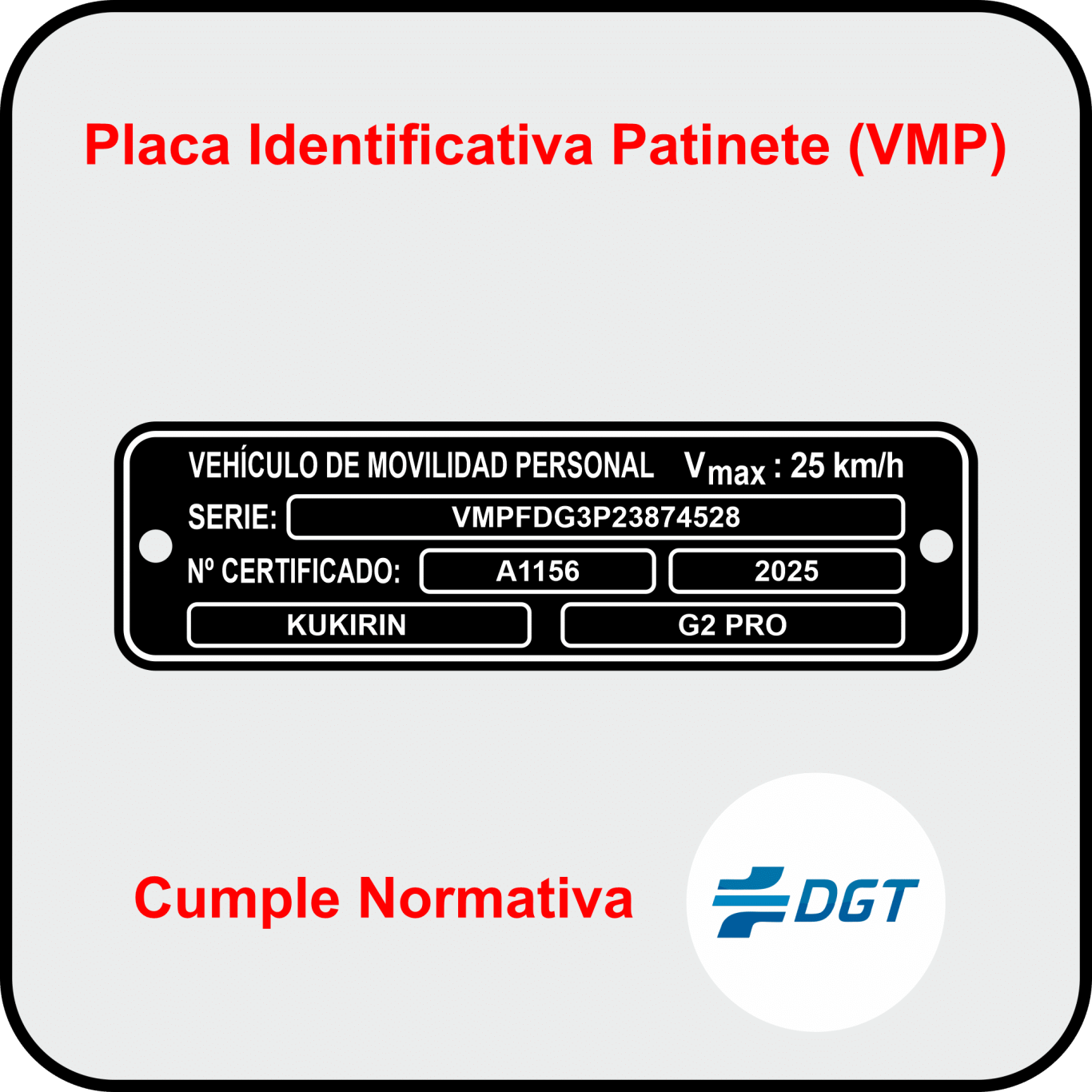 Desde enero de 2024, todos los patinetes que se comercializan deben estar certificados. La placa de matrícula (o placa de identificación) confirma que tu vehículo cumple con los estándares de seguridad exigidos por la DGT, como el sistema de frenado, la iluminación y la velocidad máxima limitada.
